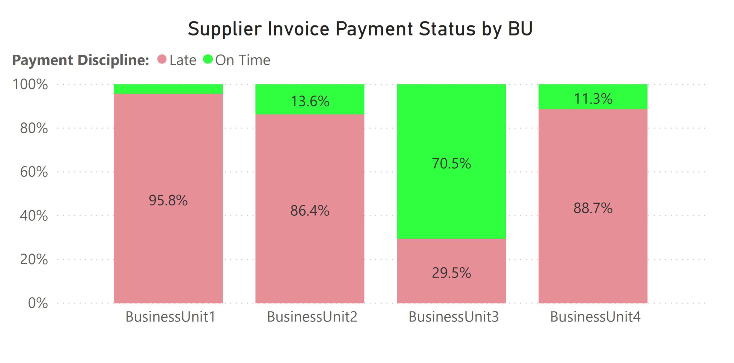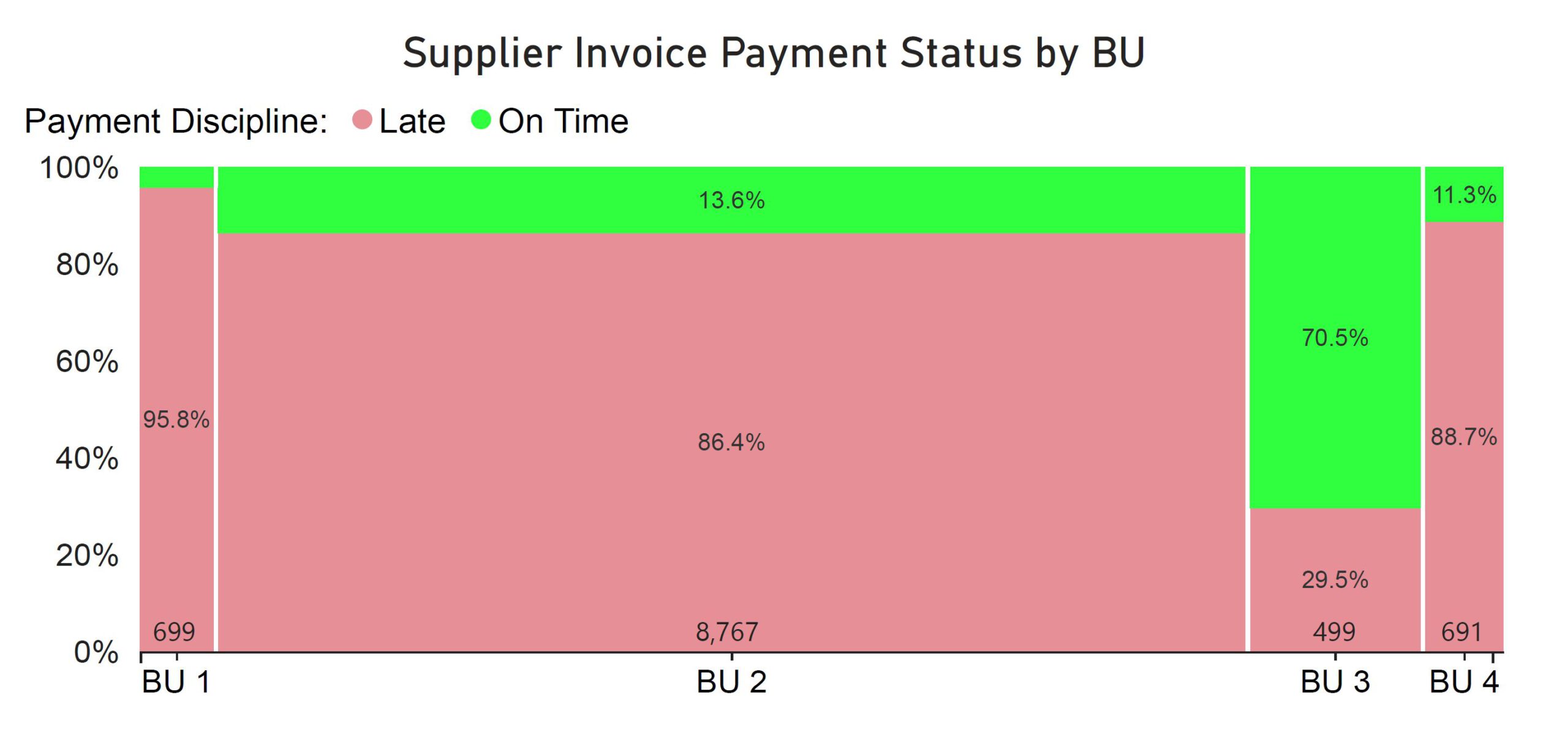 However, the following Marimekko chart (mosaic plot) illustrates the number of invoices received by each unit. It shows that BU 2 has many more suppliers waiting to get paid than all other units together. BU 2 is the real problem.
