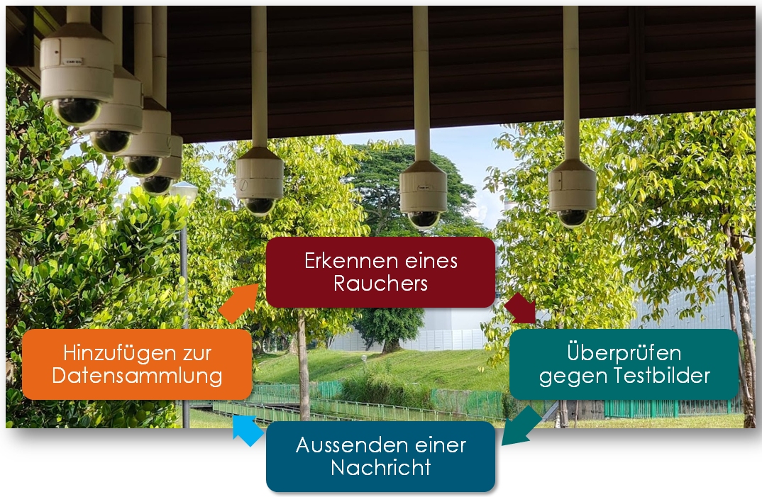 Nach dem Vergleich dieser Bilder mit Referenzbildern könnte eine Aktion ausgelöst werden, wie eine Sprachnachricht, die Parkbesucher an das Rauchverbot erinnert.