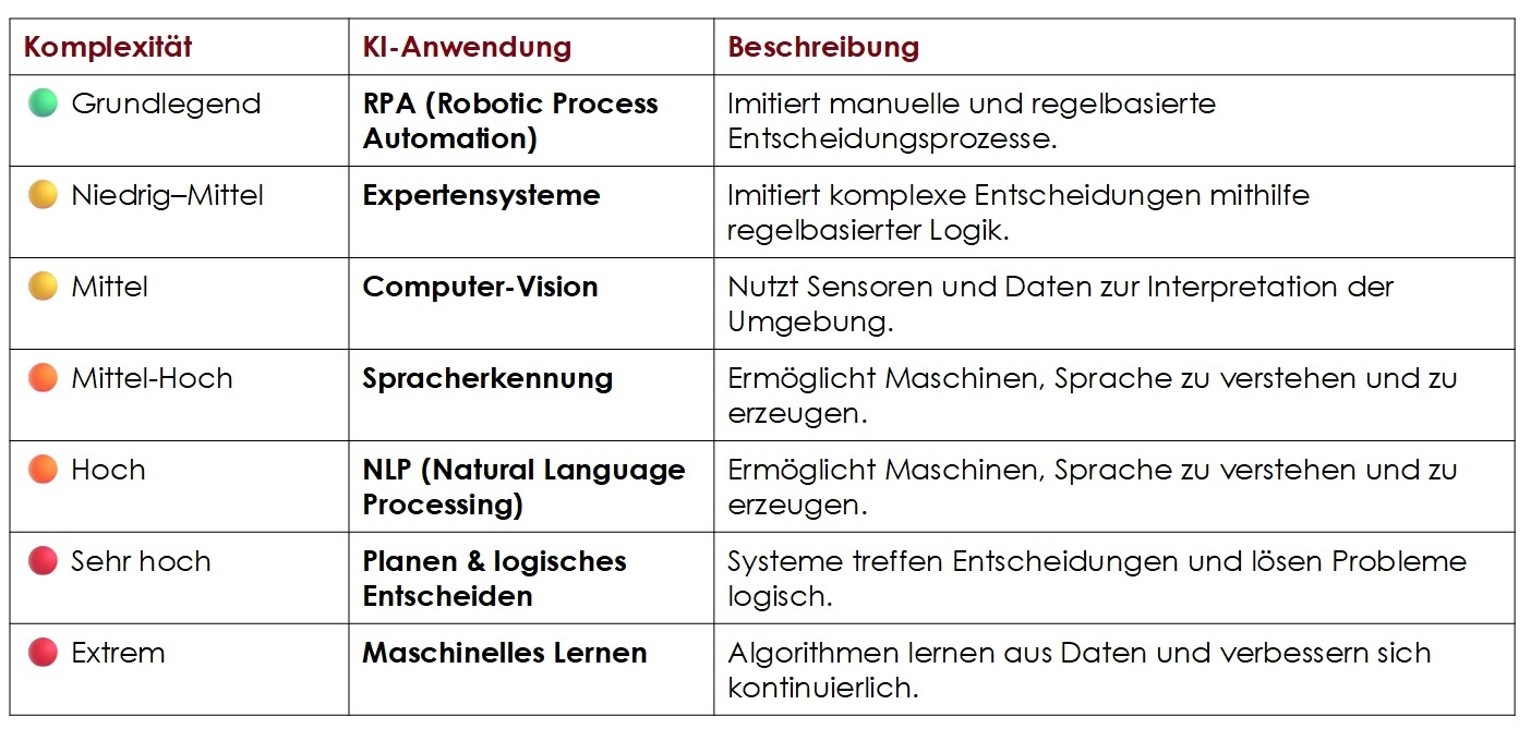 Natürlich hat RPA weit mehr Anwendungen als nur das einfache E-Mail-Postfach. Die folgende Tabelle zeigt einige Anwendungen von KI, vom Einfachen bis zum Komplexen.