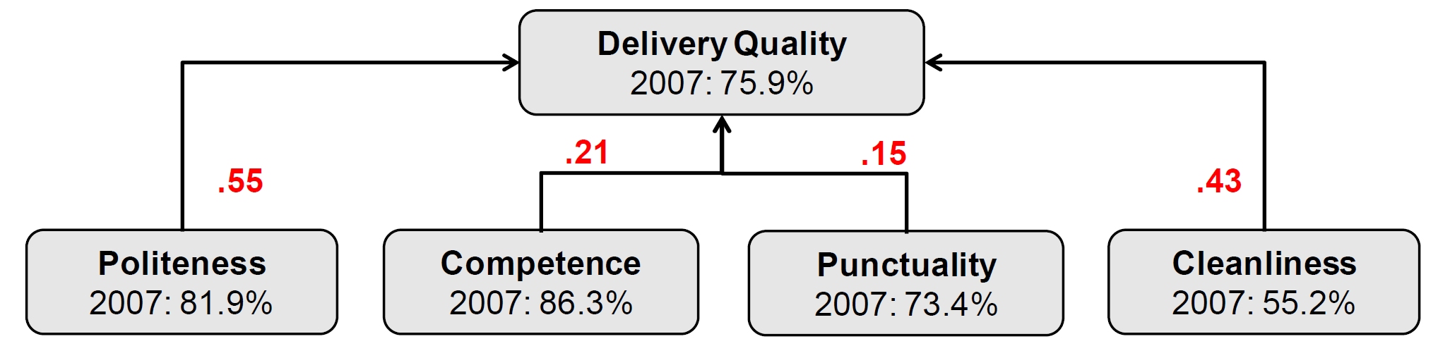 Looking into the four major drivers for Delivery Quality revealed that Cleanliness and Punctuality leave room for action and have a direct impact (0.43 and 0.55, respectively) on the sentiments on Delivery Quality.